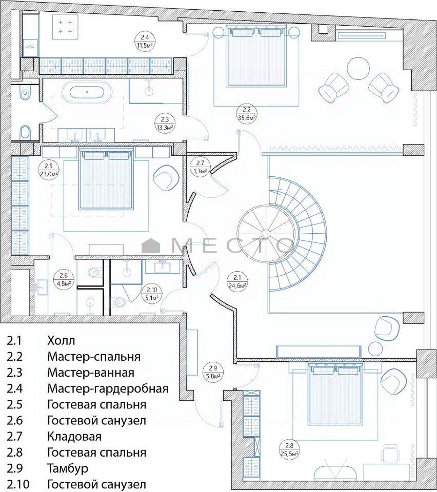 Второй этаж: три спальни с санузлами и просторная гардеробная.