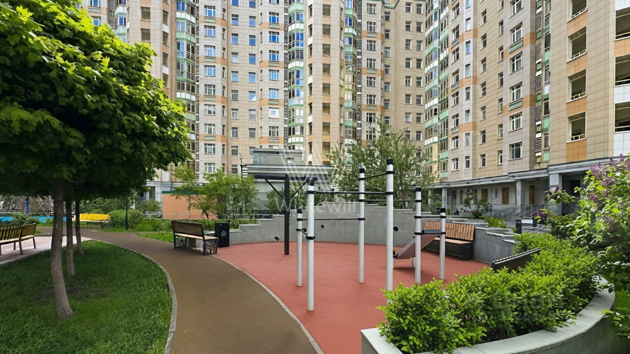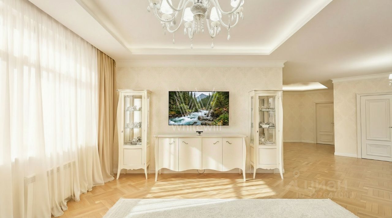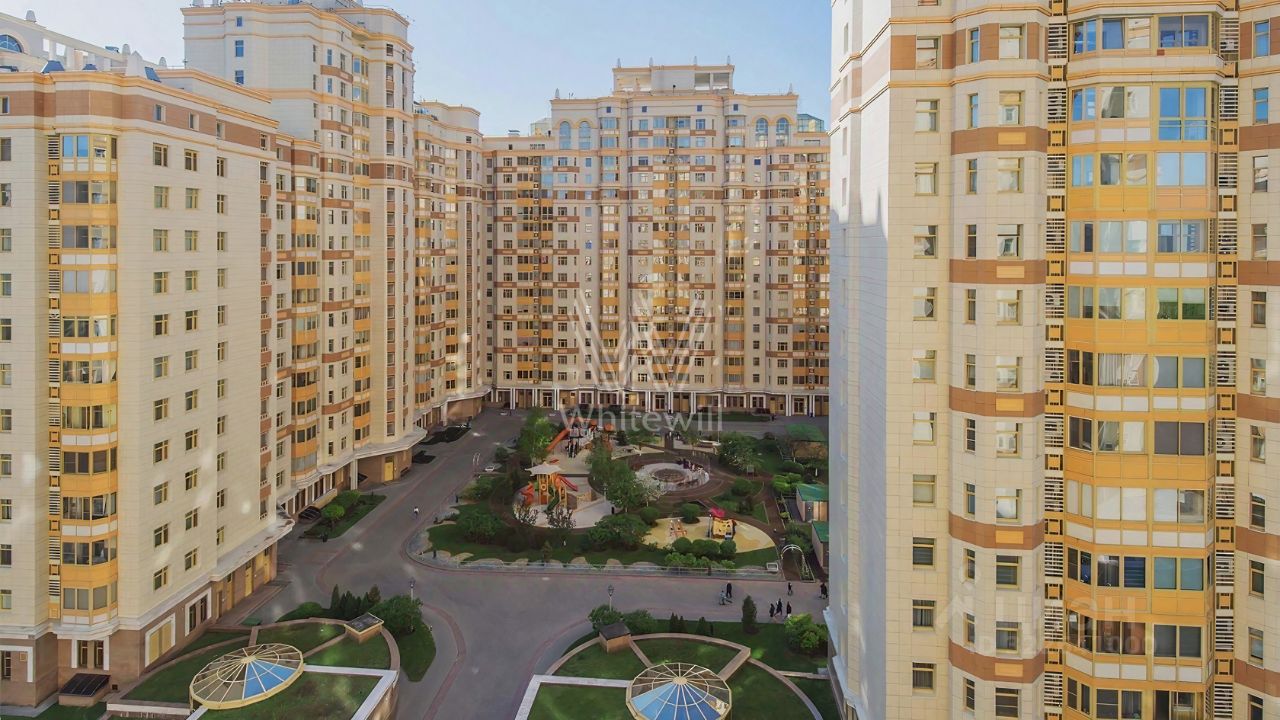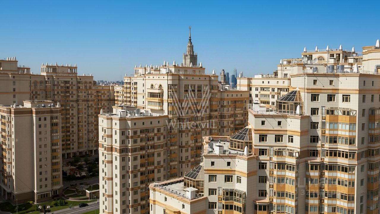 Квартира с тремя спальнями в комплексе бизнес-класса ''Доминион'' в Раменках. Квартира общей площадью сто восемьдесят семь м² расположена на четырнадцатом этаже в пятом корпусе. Выполнена дизайнерская отделка в современном стиле, на полу выложены паркетная доска и мрамор. Квартира укомплектована итальянской мебелью и премиальной техникой.