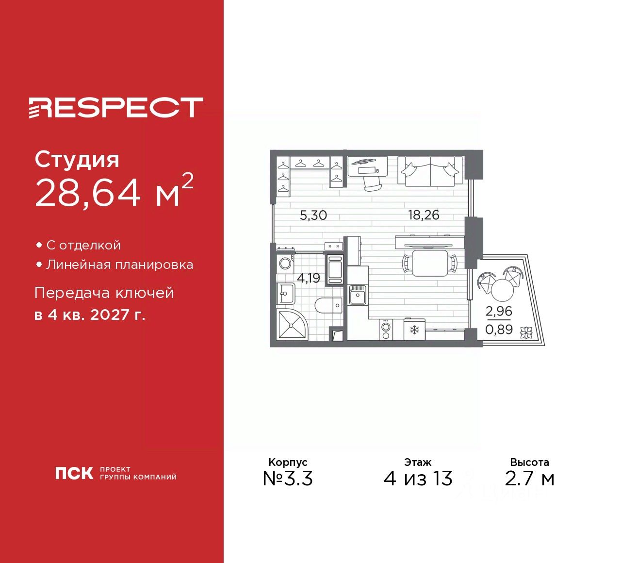 1-комн. квартира-студия с отделкой в ЖК ''RESPECT'' на 4 этаже. Общая площадь: 28.64 кв.м., площадь гостиной 18.26 кв.м., из которых 5 кв.м. выделено под кухонную зону. Все окна выходят на одну сторону. В квартире один балкон, один совмещенный санузел. Высота потолков 2.7 м.