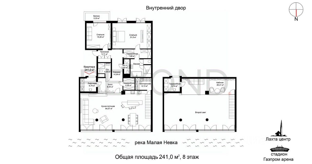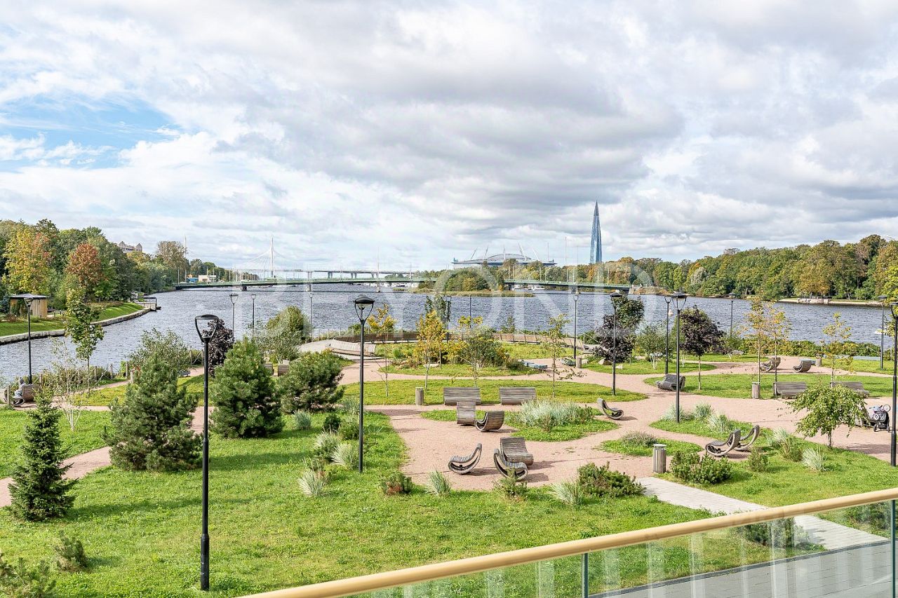 Светлая видовая квартира площадью 241 кв. м с видом на акваторию Малой Невки и парки Крестовского острова. Из панорамных окон кухни-гостиной площадью 84 кв. м открывается вид на ''Газпром Арену'', башню ''Лахта Центра'' и закаты. Высокие потолки 4,8 м наполняют квартиру солнечным светом. Окна спален выходят в тихий благоустроенный двор. Мастер-спальня площадью 31 кв. м с двумя окнами, собственной гардеробной и ванной комнатой с хаммамом. Детская спальня имеет выход на балкон. В зоне антресольного этажа возможно размещение кабинета-библиотеки или ещё одной спальни с ванной комнатой. Собственный лифт доставляет прямо в квартиру, второй вход позволяет организовать пространство в соответствии с образом жизни собственника.