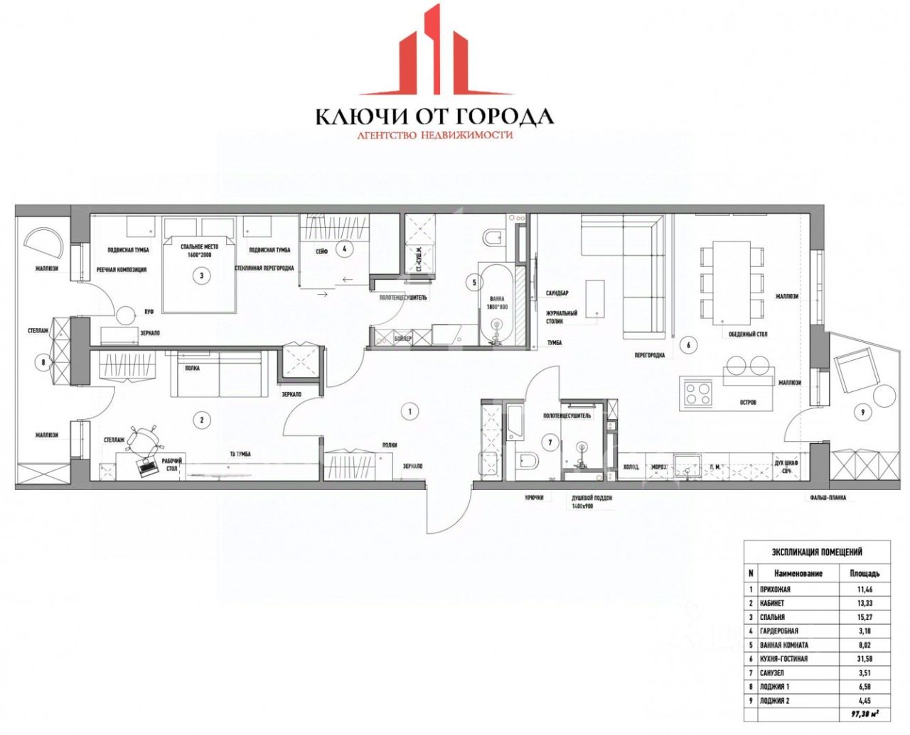 Просторная кухня-гостиная 31,58 м² с отдельным островом и индукционной плитой. Мастер-спальня 15,27 м² с гардеробной 3,18 м² и приватным санузлом 8,02 м². Уютный кабинет 13,33 м². Второй санузел 3,51 м². Две лоджии 6,58 и 4,45 м². Просторная прихожая 11,46 м² с продуманным хранением.