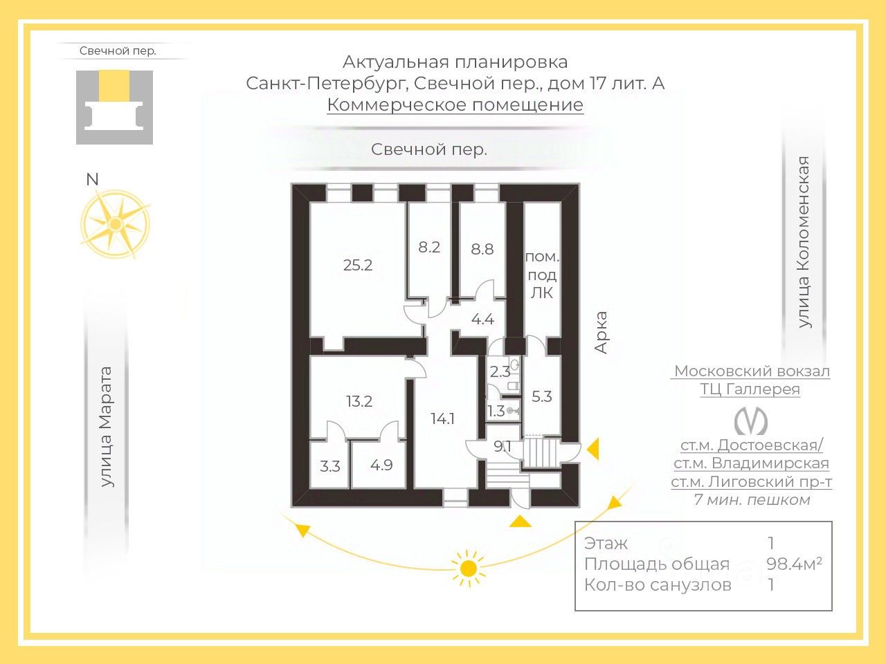 Арт. 119151291 Это самое выгодное коммерческое помещение в центральном районе! Помещение свободного назначения, подойдет под любые цели: офис, фитнес студия, йога, салон красоты, хостел, учебный центр, интернет торговли, и т.п. ПРОСМОТР ВОЗМОЖЕН С 02 ноября 2025г. Центр города с хорошей транспортной доступностью. В 7-ми минутах ходьбы ст. метро Владимирская и метро Лиговский проспект. В нескольких минутах езды на транспорте Московский вокзал. Прекрасное помещение 100 кв. м со свежим ремонтом без амортизации. Белые стены, которые при желании можете покрасить в любой цвет. Помимо рабочих помещений и переговорных, предусмотрены кухня и санузлы с душевой. Также в одном помещении дополнительно выведена вода (для раковины). Окна выходят на Свечной переулок, два входа.