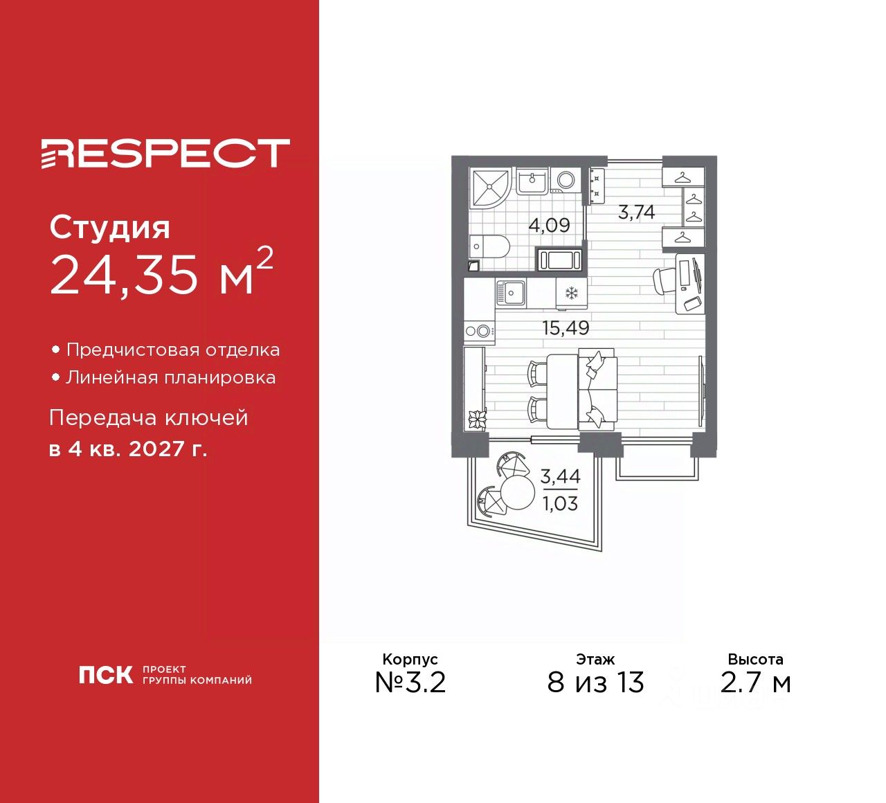Однокомнатная квартира-студия от застройщика с предчистовой отделкой в ЖК ''RESPECT'' на 8 этаже. Общая площадь: 24.35 кв.м., площадь гостиной 15.49 кв.м., из которых 5 кв.м. выделено под кухонную зону. Все окна выходят на одну сторону. В квартире один балкон, один совмещенный санузел. Высота потолков 2.7 м.