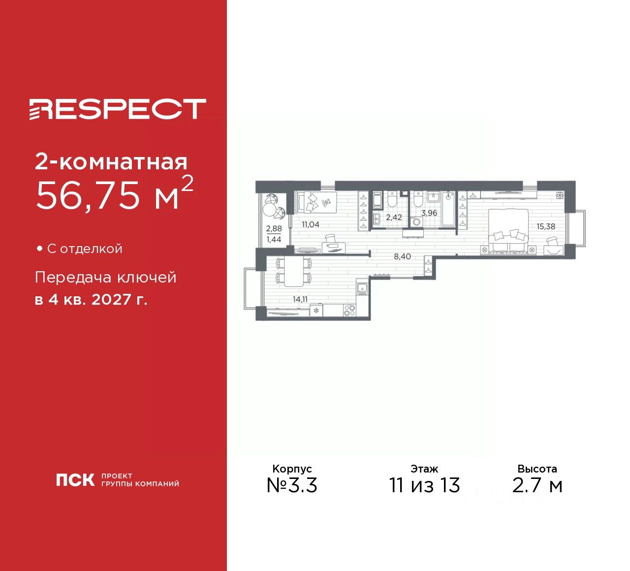 Продается двухкомнатная квартира с отделкой в ЖК ''RESPECT'' на 11 этаже. Общая площадь: 56.75 кв.м., жилая: 26.42 кв.м., площадь просторной кухни-столовой: 14.11 кв.м. Квартира без проходных комнат, окна выходят нa три cтopoны дома. В квартире одна лоджия, один совмещенный и один раздельный санузел. Высота потолков 2.7 м.