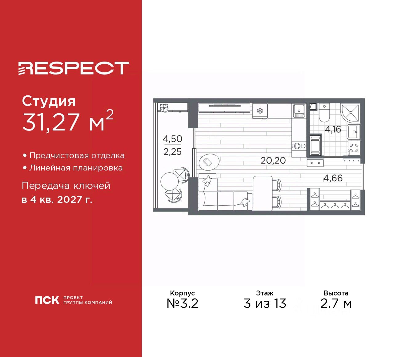 Продается 1-комн. квартира-студия от застройщика с предчистовой отделкой в ЖК ''RESPECT'' на 3 этаже. Общая площадь: 31.27 кв.м., площадь гостиной 20.2 кв.м., из которых 5 кв.м. выделено под кухонную зону. Все окна выходят на одну сторону. В квартире один балкон, один совмещенный санузел. Высота потолков 2.7 м.