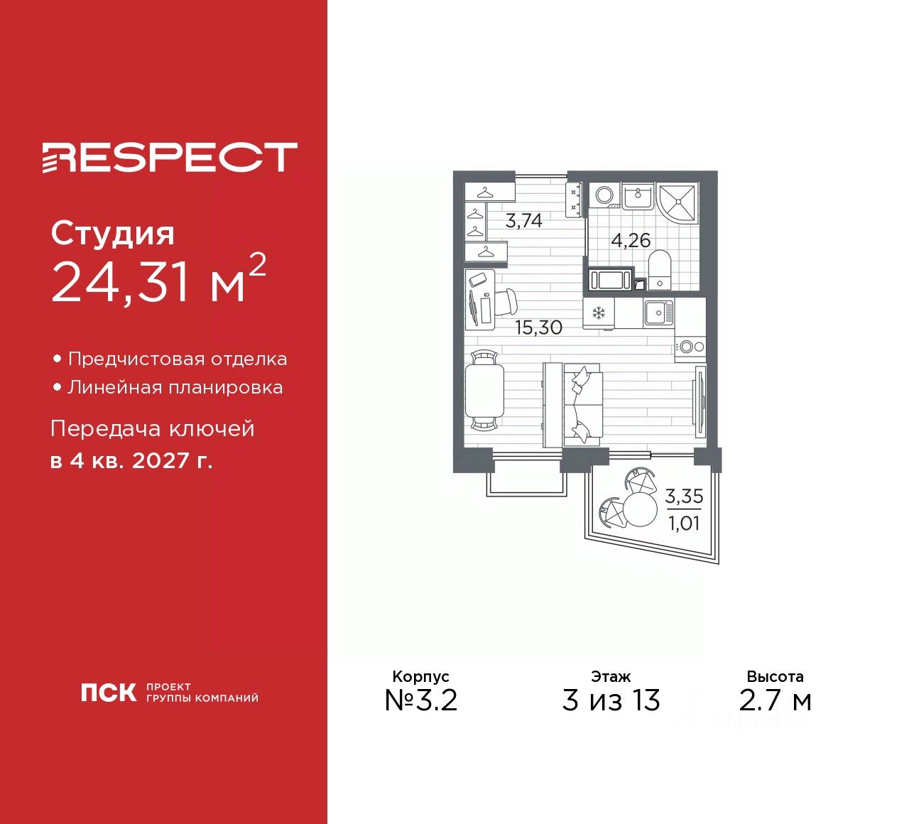 1-комн. квартира-студия с предчистовой отделкой в ЖК ''RESPECT'' на 3 этаже. Общая площадь: 24.31 кв.м., площадь гостиной 15.3 кв.м., из которых 5 кв.м. выделено под кухонную зону. Все окна выходят на одну сторону. В квартире один балкон, один совмещенный санузел. Высота потолков 2.7 м.