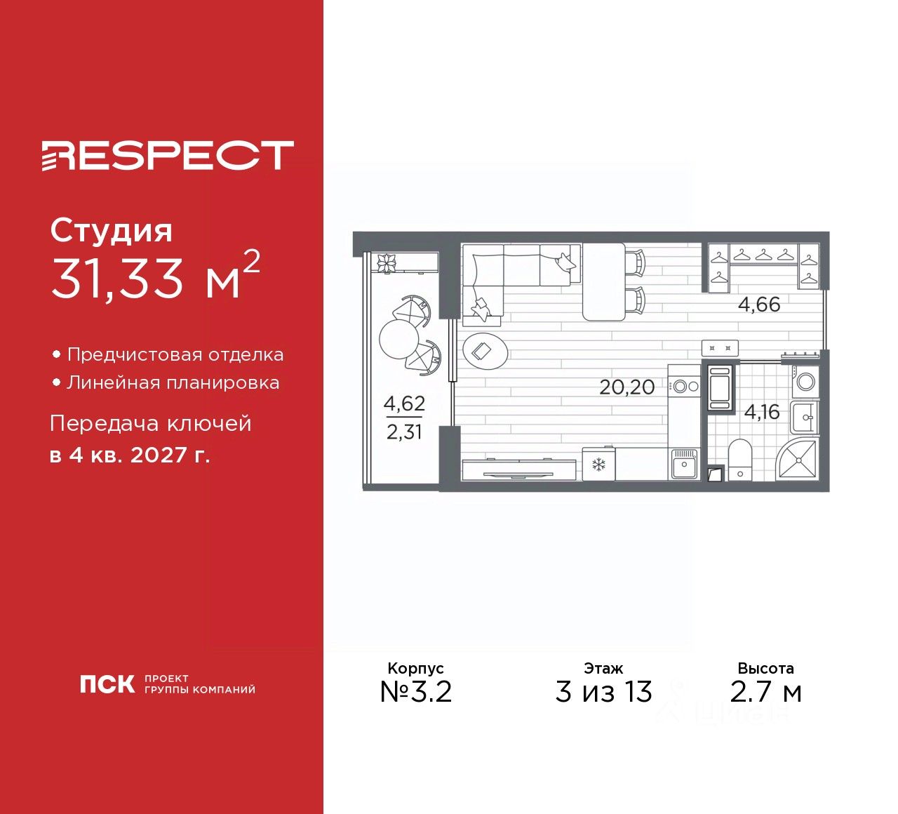 Продается однокомнатная квартира-студия с предчистовой отделкой в ЖК ''RESPECT'' на 3 этаже. Общая площадь: 31.33 кв.м., площадь гостиной 20.2 кв.м., из которых 5 кв.м. выделено под кухонную зону. Все окна выходят на одну сторону. В квартире один балкон, один совмещенный санузел. Высота потолков 2.7 м.
