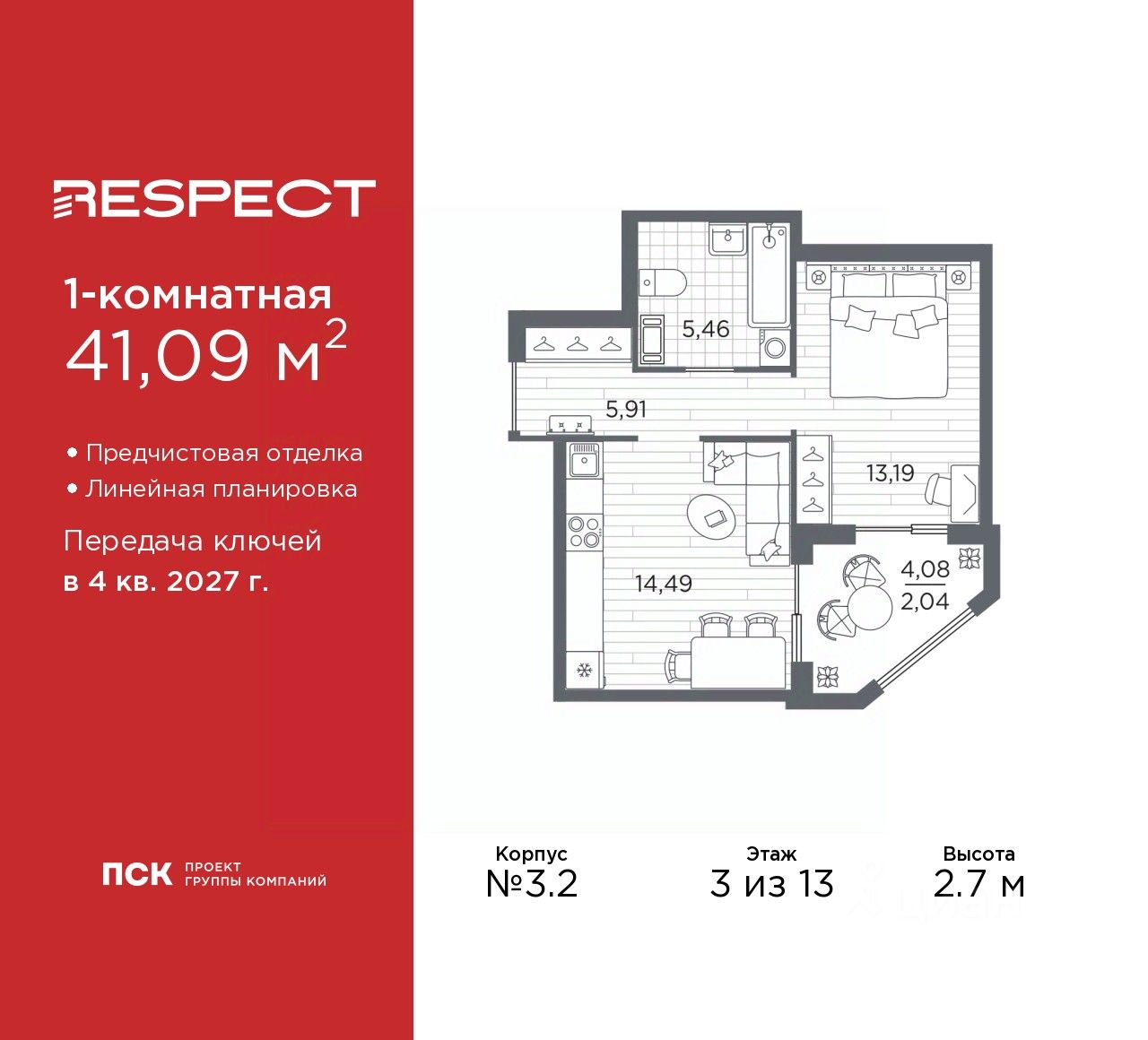1-комн. квартира с предчистовой отделкой в ЖК ''RESPECT'' на 3 этаже. Общая площадь: 41.09 кв.м., жилая: 13.19 кв.м., площадь просторной кухни-столовой: 14.49 кв.м. Все окна выходят на одну сторону. В квартире одна лоджия, один совмещенный санузел. Высота потолков 2.7 м.