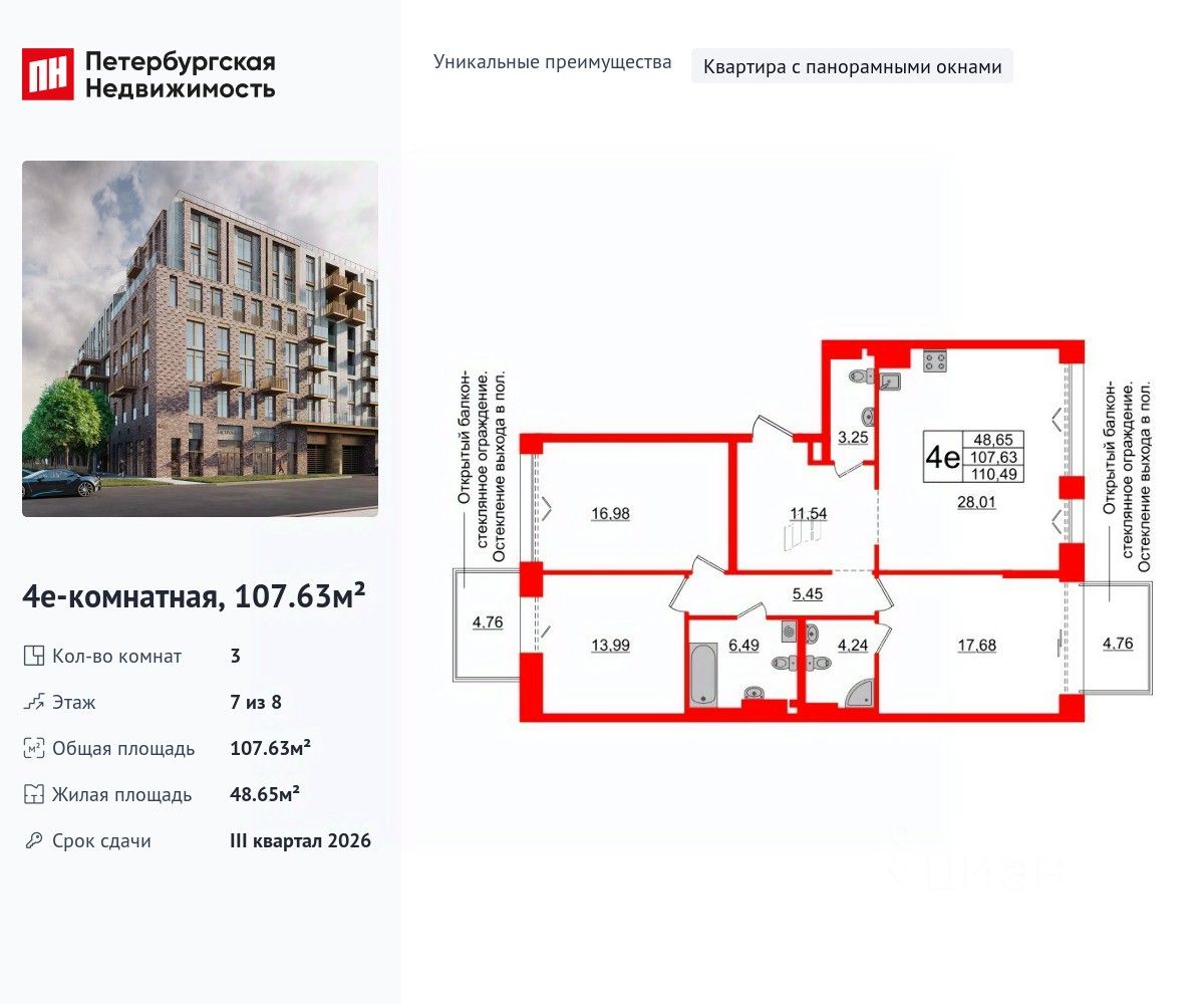 Уникальная, функциональная европланировка, большая кухня-гостиная 28.01 м², вместительная прихожая 11.54 м². Общая площадь квартиры - 107.63 м², жилая 48.65 м².