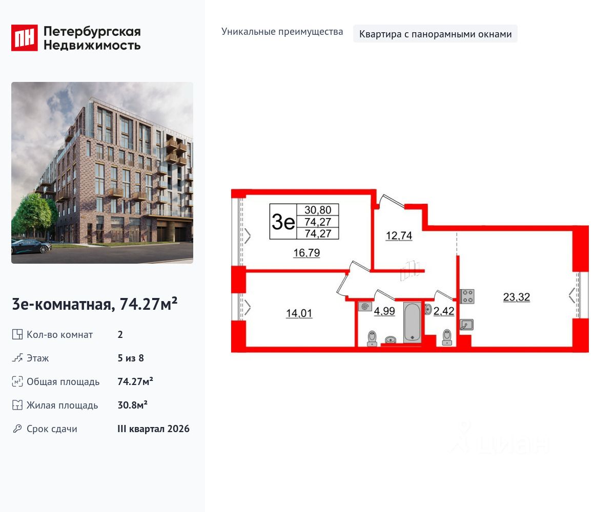 Уникальная, функциональная европланировка, большая кухня-гостиная 23.32 м², просторная прихожая 12.74 м². Общая площадь квартиры - 74.27 м², жилая 30.8 м², высота потолка 3 м.