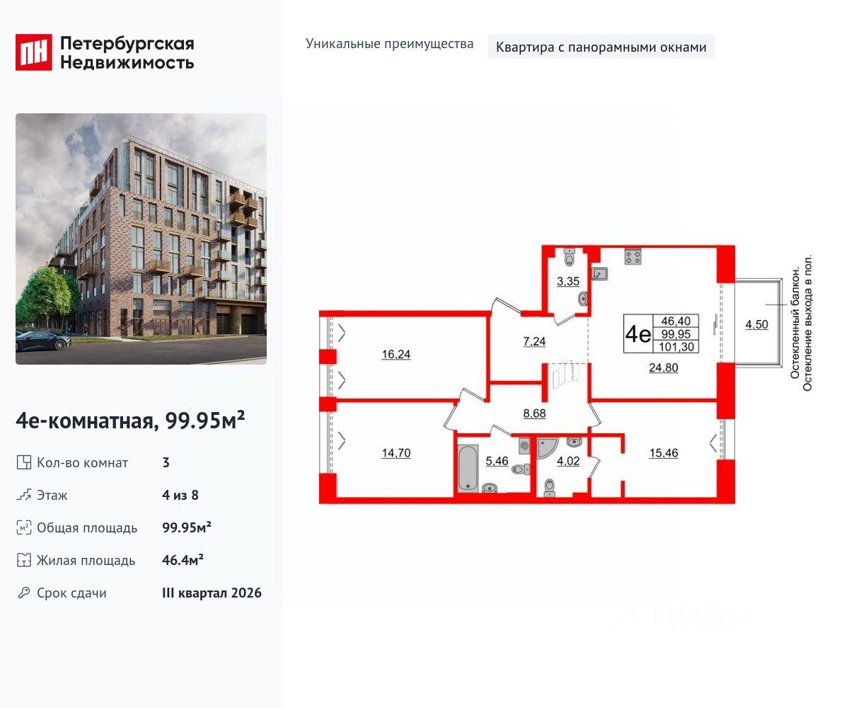 Уникальная, функциональная европланировка, большая кухня-гостиная 24.8 м², вместительная прихожая 7.24 м². Общая площадь квартиры - 99.95 м², жилая 46.4 м², высота потолка 3 м.