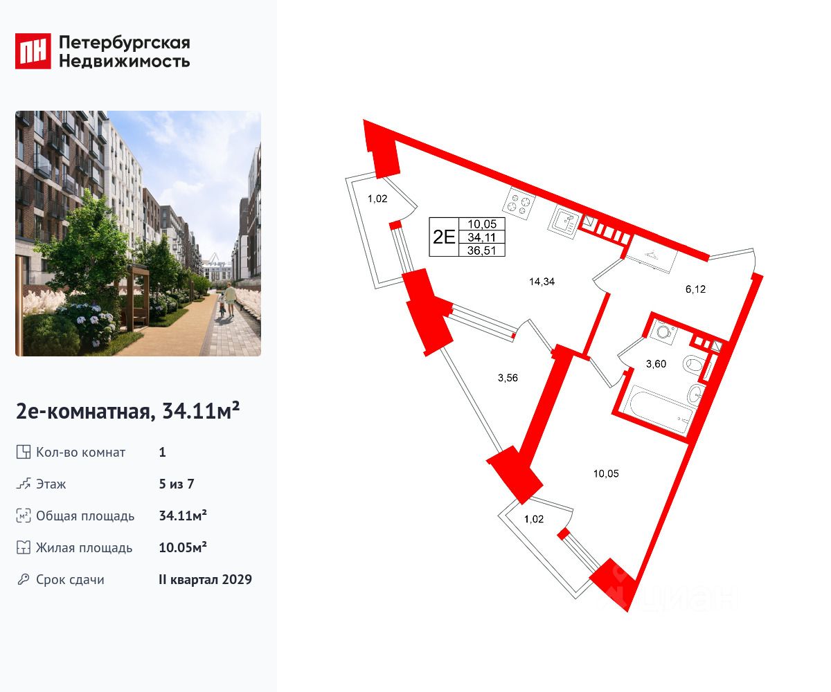 Удобная, классическая, функциональная европланировка, большая кухня-гостиная 14.34 м², просторная прихожая 6.12 м². Общая площадь квартиры - 34.11 м², жилая 10.05 м², высота потолка 3 м.