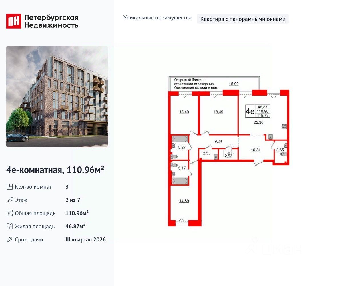 Уникальная, функциональная европланировка, большая кухня-гостиная 25.36 м², вместительная прихожая 10.34 м². Общая площадь квартиры - 110.96 м², жилая 46.87 м², высота потолка 3 м.