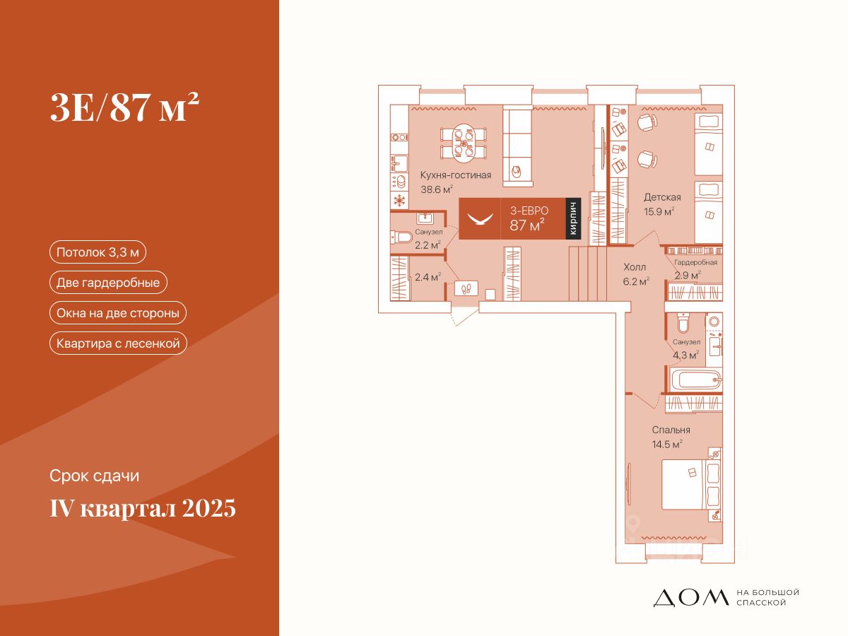 Квартира с увеличенным потолком 3.3 метра. Окна выходят на две стороны, а в детской и спальне стоят увеличенные рамы. Для одежды и вещей — дополнительные места под хранение в двух гардеробных. Они продуманы в разных частях квартиры.