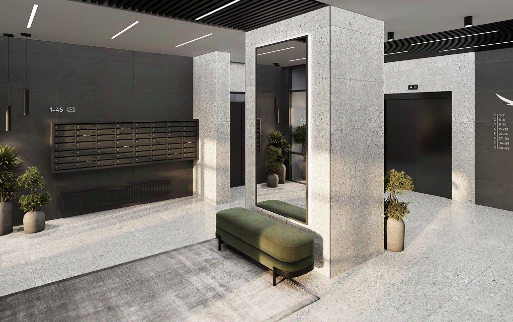 Внутри готова предчистовая отделка: стены оштукатурены и выровнены по общему уровню, на полу слой цементно-песчаного раствора с дополнительным гидроизоляционным слоем в ванной. Проведена электрика и готовы розетки с выключателями. А ещё установлены сейф-двери и счётчики с телеметрией.