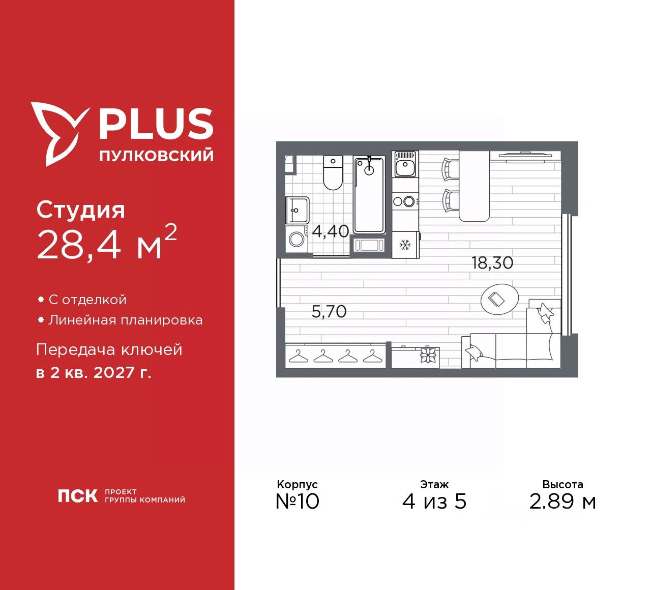 1-комн. квартира-студия от застройщика с отделкой в ЖК ''PLUS Пулковский'' на 4 этаже. Общая площадь: 28.4 кв.м., площадь гостиной 18.3 кв.м., из которых 5 кв.м. выделено под кухонную зону. Все окна выходят на одну сторону. В квартире один совмещенный санузел. Высота потолков 2.89 м.