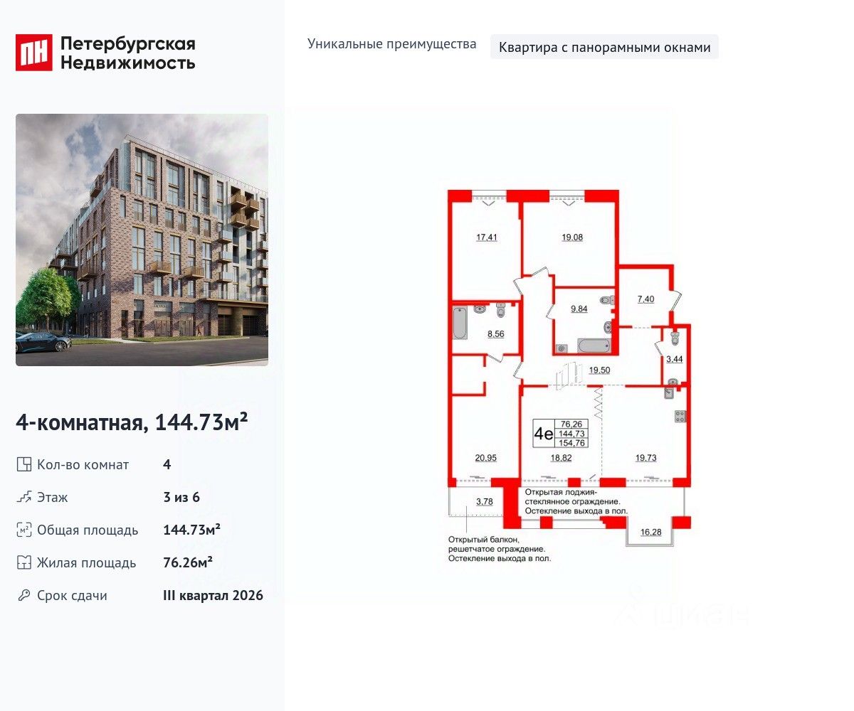 Уникальная планировка, кухня 19.73 м², вместительная прихожая 7.4 м². Общая площадь квартиры - 144.73 м², жилая 76.26 м², высота потолка 3 м.