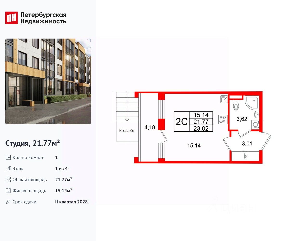 Удобная, классическая, функциональная европланировка, вместительная прихожая 3.01 м². Общая площадь студии - 21.77 м², жилая 15.14 м², высота потолка 2.77 м.