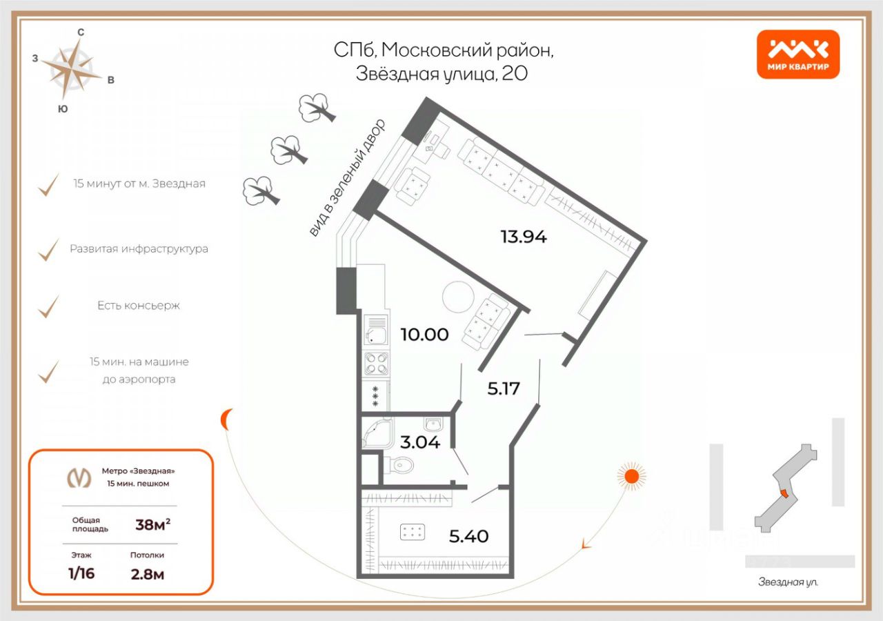 Район отличается развитой инфраструктурой: в шаговой доступности находятся школы, детские сады, поликлиники, продуктовые магазины и остановки общественного транспорта. До метро Звёздная можно дойти за 15 минут, а до аэропорта — доехать за 10-15 минут на машине. Квартира в собственности более пяти лет, один взрослый собственник. Прямая продажа, возможен любой способ оплаты.