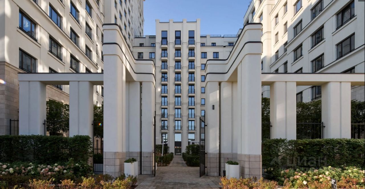 Вход во двор организован через колоннаду. Планировочно он разделён на две части. Парадный партер с большим количеством стриженых растений, фонтанами, цветущими кустарниками и более ''домашняя'', уютная зона, где высажены деревья и низкорослые хвойные растения, многолетники. В центре двора — две детские площадки. #zmmUOW