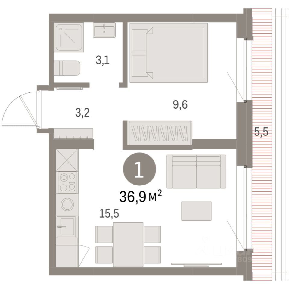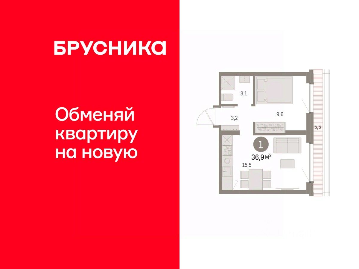 Квартира с кухней-гостиной и одной спальней в Бруснике в Академическом. Особенности планировки: предчистовая отделка, терраса на крыше. квартиры в нашей базе: АКД05-Ж4.7.5.