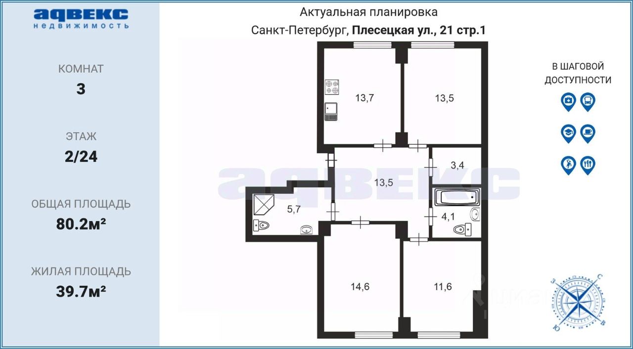продам 3-к, Плесецкая, 2118 800 000 ₽