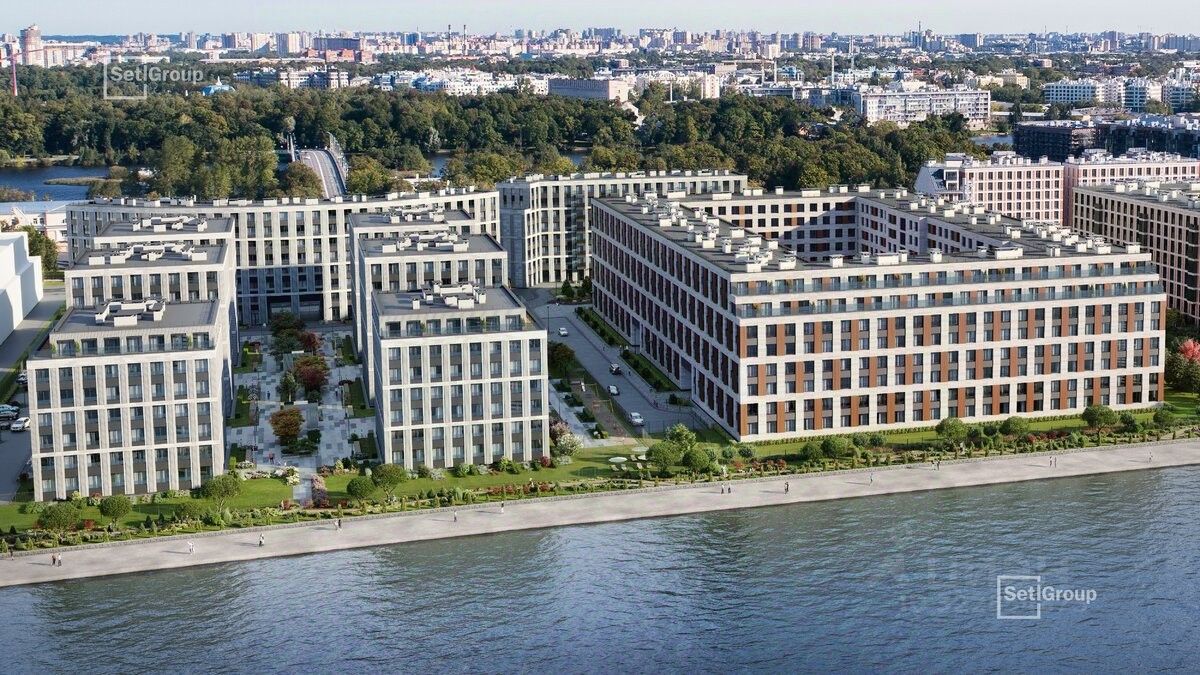 Композиция проекта - современная трактовка классических архитектурных традиций. Дом высотой от 6 до 8 этажей имеет правильную форму каре с уютным двором в центре. Фасады будут облицованы натуральным камнем, керамогранитом и экологичными терракотовыми панелями. За счет благородных материалов и гармоничной светлой палитры создается благородный облик. Главные фасады обращены в сторону Петровского проспекта и Малой Невы. Вдоль линии воды расположатся квартиры с открытыми просторными террасами, откуда открываются панорамные виды. Доступ на территорию дома и в парадную осуществляется через центральную входную группу с reception и круглосуточной охраной.