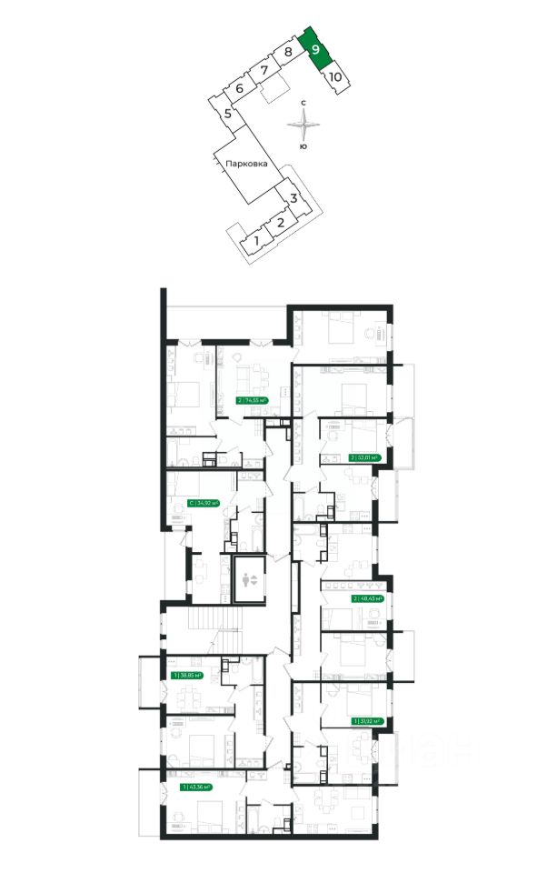 Напрямую продаётся 2 комнатная квартира 279 на 4 этаже (из 8) общей площадью 74,55 м2 в III очереди в жилом комплексе Сертолово Парк от застройщика ГК Алгоритм.