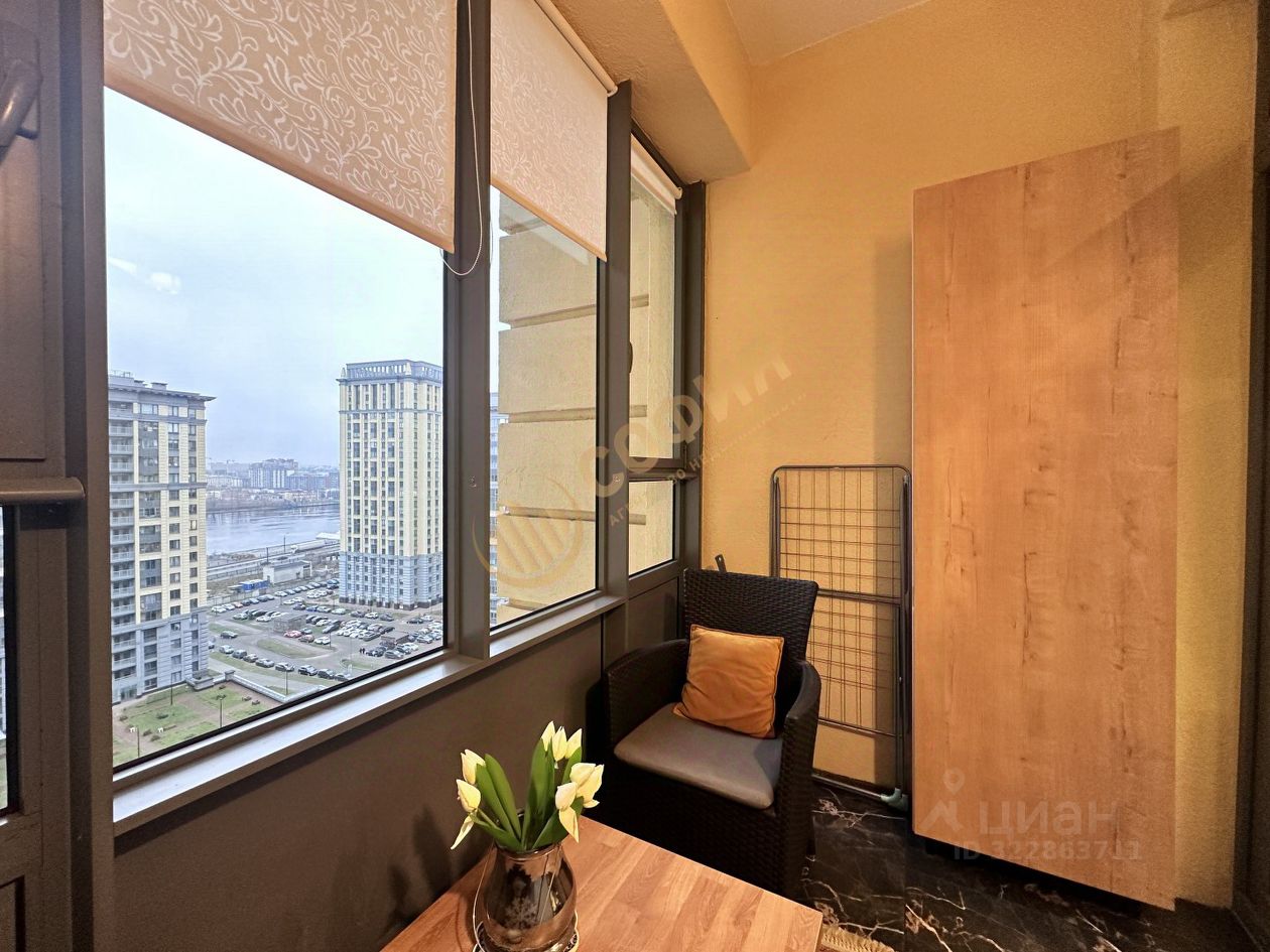+На лоджии создан отдельный уголок отдыха с видом на Неву. Комплект садовой мебели, жалюзи, мягкое освещение и розетки. Все хозяйственные мелочи спрятаны в отдельном шкафу (пылесос, гладильная доска, утюг, сушилка для белья).
