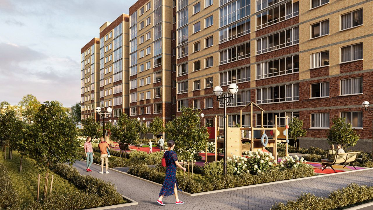 Кирпичные дома с бесшумными лифтами, детские площадки, аллеи и лаунж-зоны в окружении зелени. Концепция ''двор без машин'' создает безопасное пространство для детей и жителей.