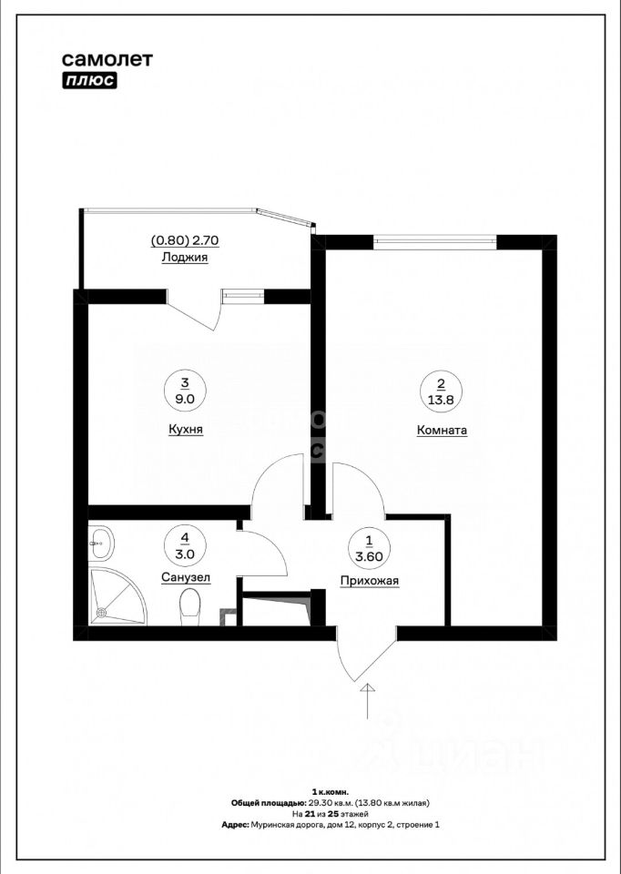 О КВАРТИРЕ: Общая площадь квартиры - 29,3 кв. м. Жилая площадь - 13,8 кв. м. Кухня - 9 кв. м. Сан.узел совмещенный - 3 кв.м. Лоджия - 2.70 кв. м. Высота потолков - 2,6 м.