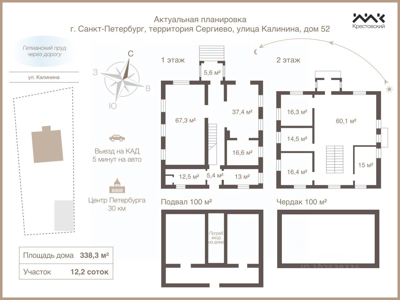 Общая площадь двух этажей — 338 м². Также есть цоколь 100 м² и тёплый чердак 100 м² с высотой потолков 4 метра в коньке. Установлены тёплые полы на кухне и в санузле.