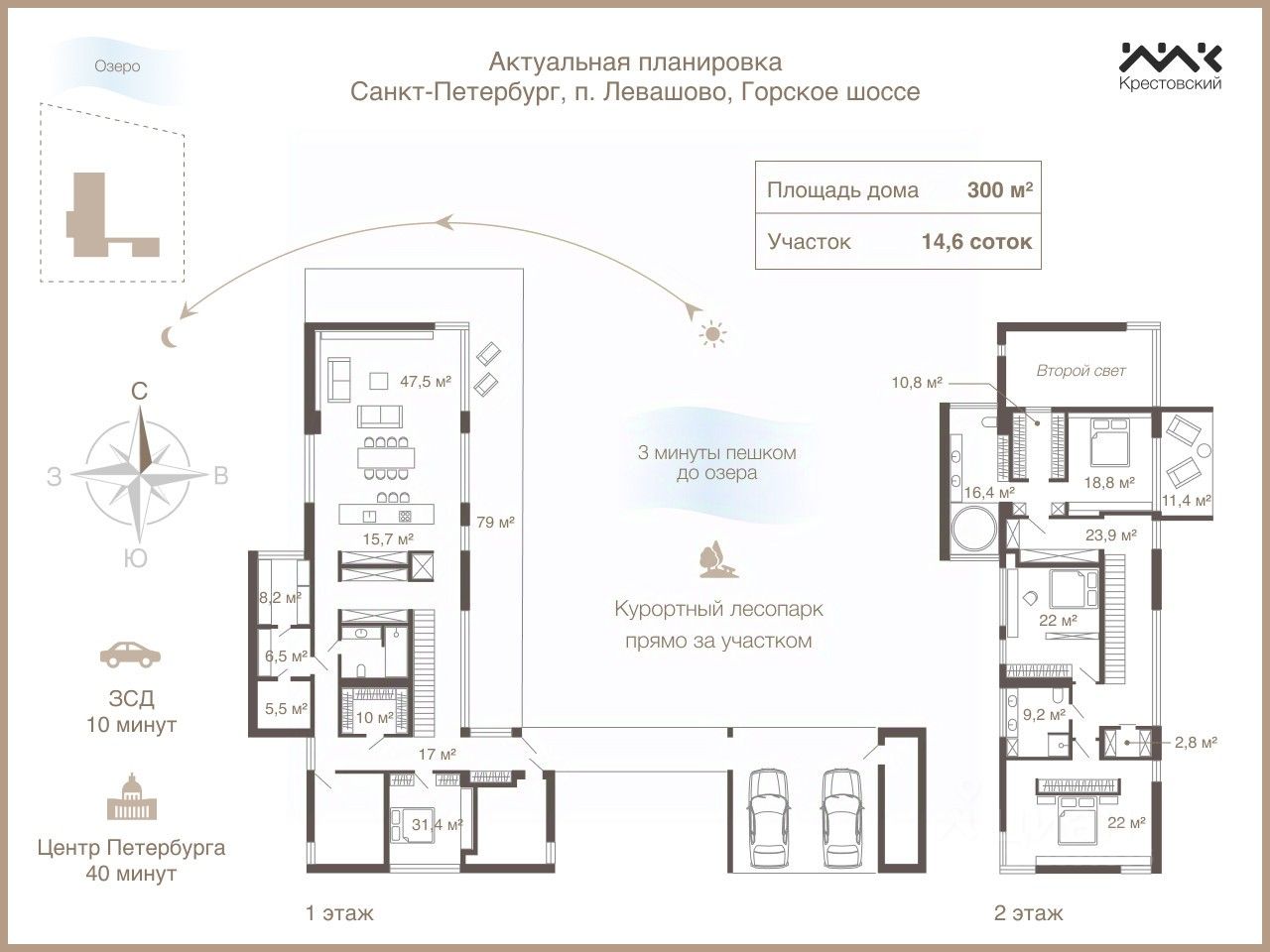 Продуманная планировка для комфортной жизни. Планировочное решение дома отражение современного стиля и функциональности. Здесь предусмотрено пять просторных спален, эргономичная кухня, уютная столовая зона, большая гостиная площадью 45 м² с эффектным вторым светом и потолками высотой 6 метров, создающими ощущение масштаба и свободы. Сауна в доме станет идеальным местом для релаксации, множество продуманных помещений для хранения обеспечат безупречный порядок, а зона барбекю и просторная терраса 80 м² отлично подойдут для теплых семейных вечеров или умиротворяющего отдыха наедине с собой. Рядом с домом в едином архитектурном стиле построен монолитный гараж на два автомобиля, что добавляет удобства и завершенности всему архитектурному образу.