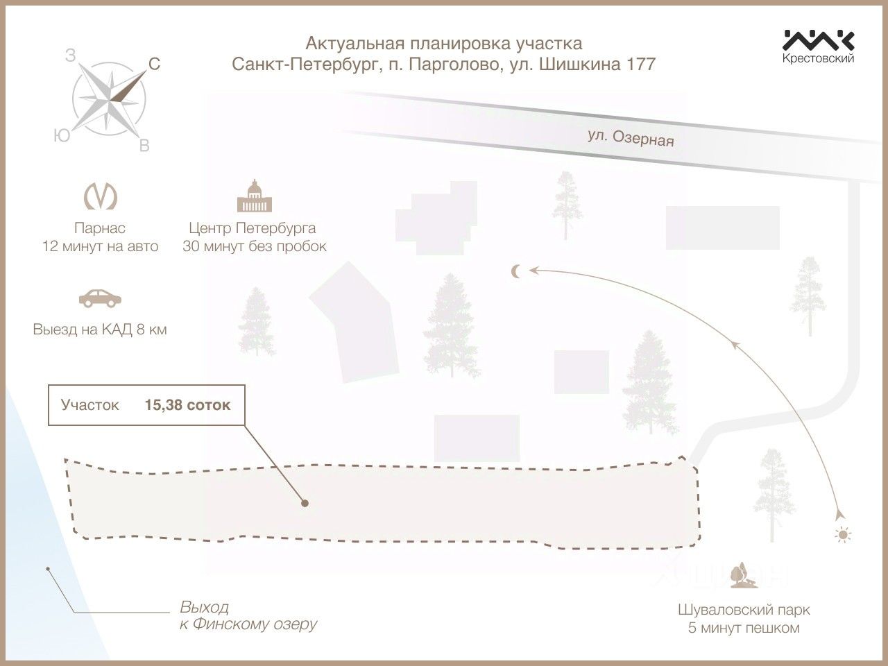 Видовой участок ИЖС с собственным выходом к Финскому озеру в черте Санкт-Петербурга — редкая возможность строительства у воды с городской пропиской. Участок площадью 15,38 соток прямоугольной формы расположен на небольшой возвышенности с видом на озеро. Собственный выход к воде открывает возможности для купания, рыбалки и отдыха — в озере водится щука, а рядом находится песчаный пляж. Есть ровный асфальтированный подъезд. На территории растут яблони, много малины и зелени. Уникальная особенность — собственный родник на участке, что обеспечивает доступ к чистой природной воде.