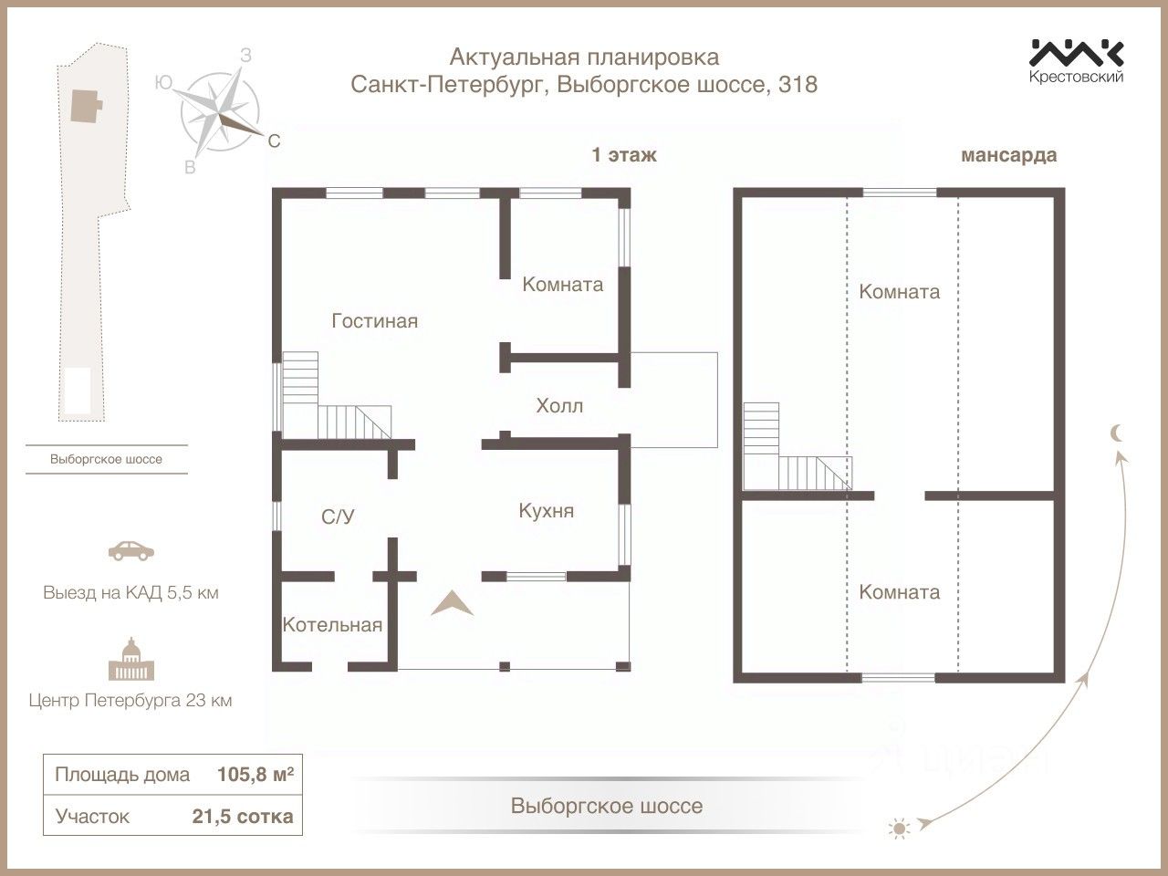 Арт. 116995320 Этот эксклюзивный участок в выгодной локации открывает широкие возможности как для комфортной семейной жизни, так и для реализации коммерческих проектов с высоким потенциалом доходности. На участке 21,49 соток расположены двухэтажный коттедж (105,8 м²) и двухэтажный гараж (139,8 м²). В доме есть кухня-гостиная, три комнаты, веранда и два входа. Водяные тёплые полы, газовый котёл и центральное водоснабжение обеспечивают современный комфорт. Участок имеет собственный выезд на Выборгское шоссе с карманом для парковки автомобилей. Петербургская прописка и удобный доступ к КАД делают локацию особенно привлекательной.