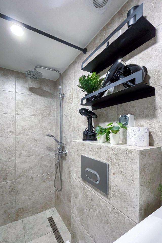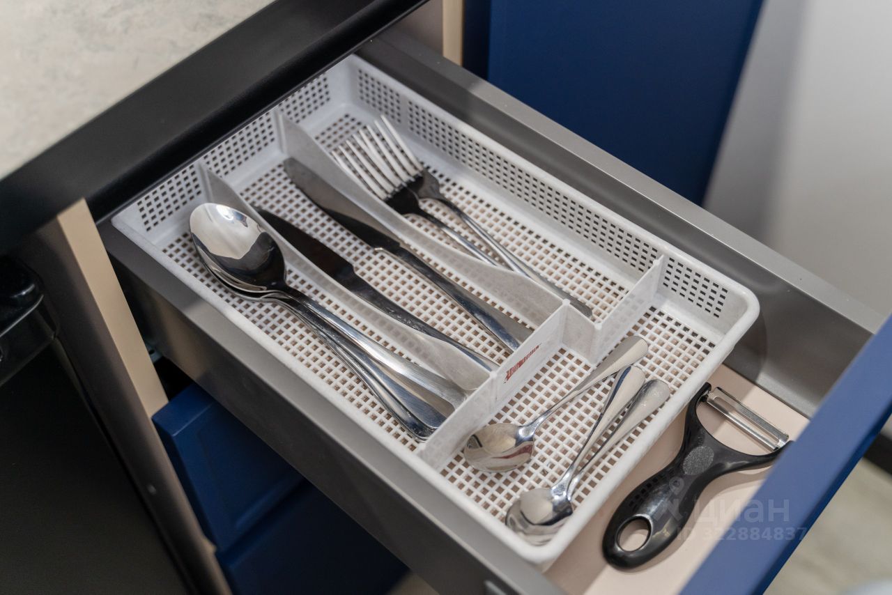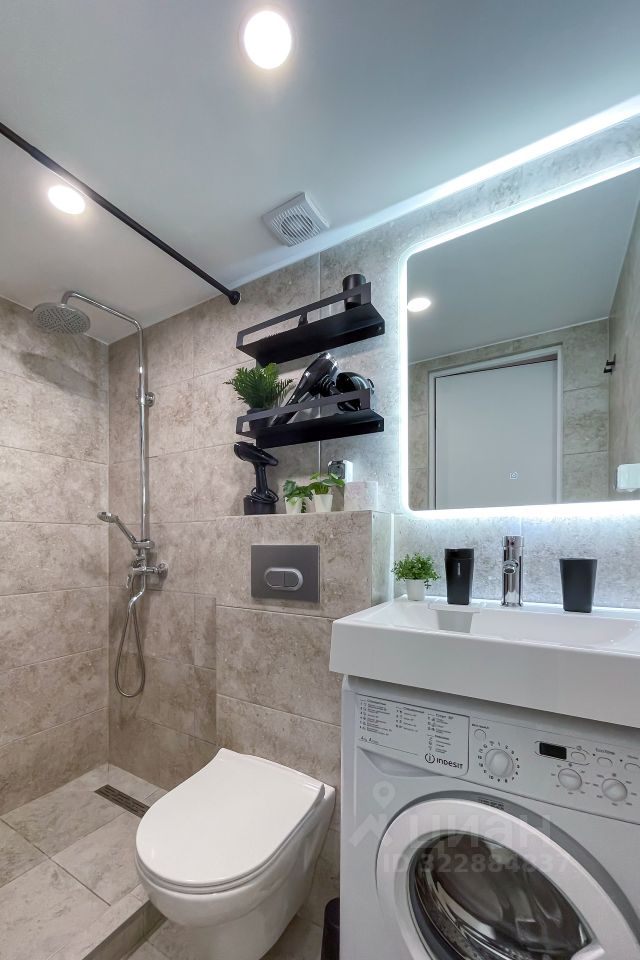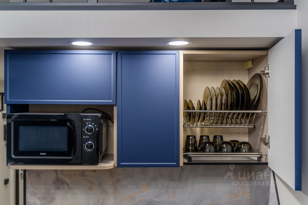 Кухня-гостиная со встроенной техникой: варочная панель, микроволновая печь, фильтр для воды, холодильник Окна с видом на Малую посадскую улицу Современная ванная комната с гавайским душем и стильной отделкой Шкафчик для хранения вещей