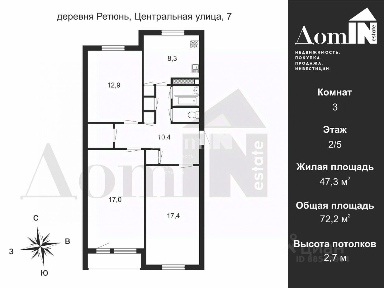 Арт. 105035768 Продаётся просторная трёхкомнатная квартира в деревне Ретюнь. Идеальный вариант для семьи или для пожилой пары к которой приезжают внуки на каникулы.