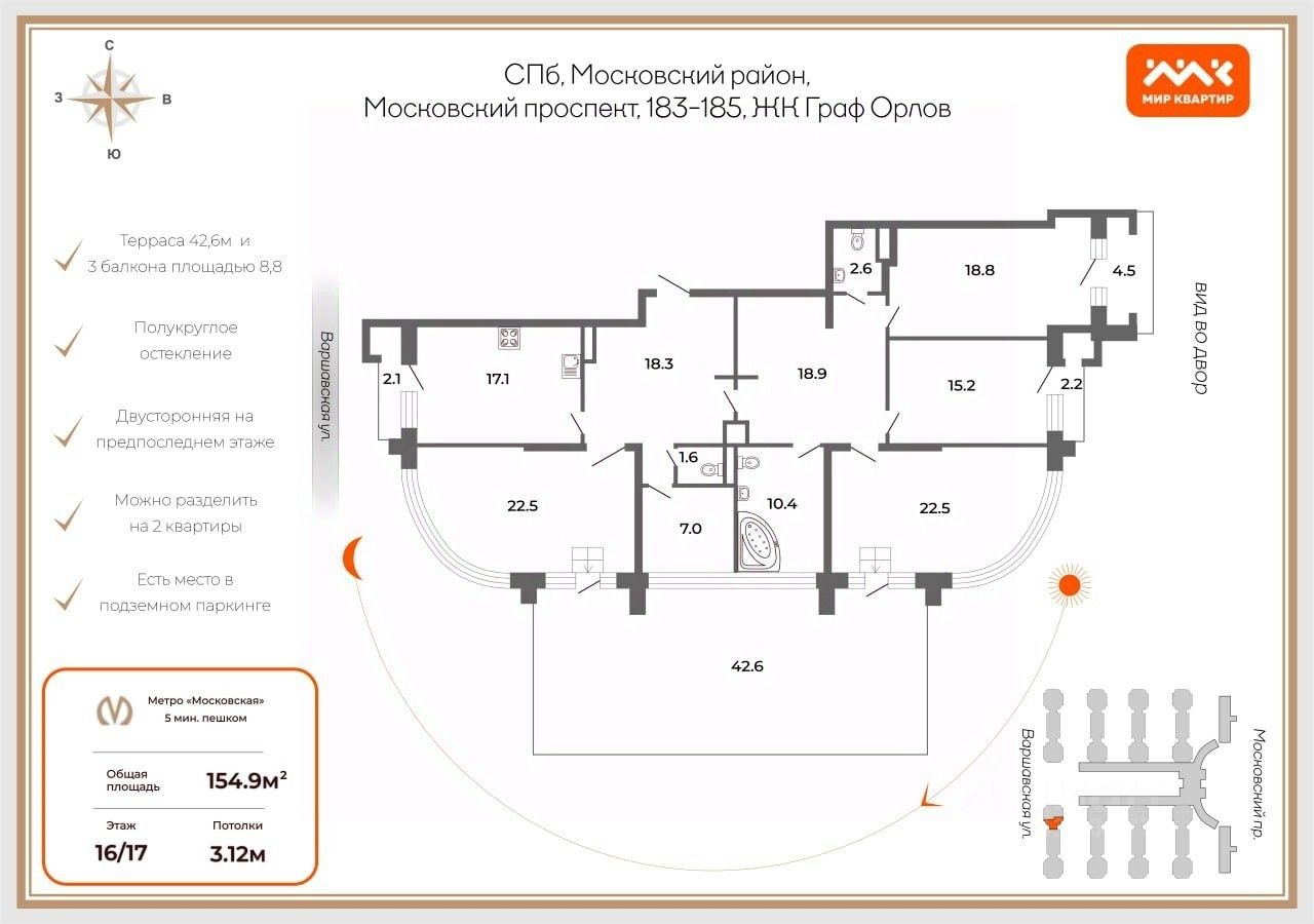 Арт. 120258810 Вашему вниманию предлагается эксклюзивная 5К квартира 154,9 м2, (площадь указана без террасы!) в ЖК ''Граф Орлов''