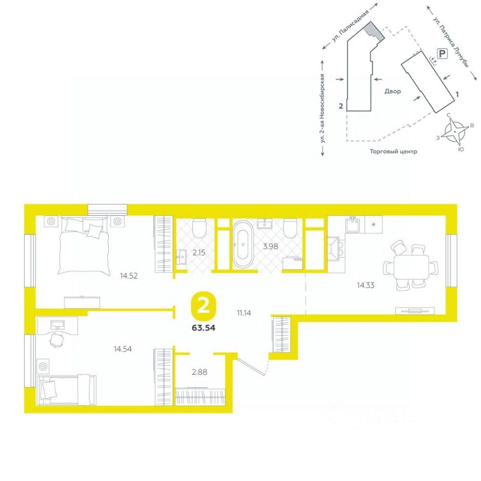 Квартира находится в ЖК ''Бодровский'' от федерального застройщика ''Паритет Девелопмент''. Это жилой комплекс комфорт-класса с современной архитектурой, расположенный в Екатеринбурге в районе улиц Патриса Лумумбы и 2-й Новосибирской. Добраться от него до центра города можно всего за 25 минут, дорога до ЕКАДа займет 12 минут. В окружении жилого комплекса есть шесть детских садов, пять школ, три больших парка, пять спорткомплексов, в том числе курортный комплекс Уктус. Квартал состоит из двух секций переменной этажности (от 14 до 24 этажей) и подземного паркинга с кладовыми, к которым можно будет спуститься на лифте. На первых этажах предусмотрены коммерческие помещения: жители смогут сделать маникюр, воспользоваться услугами ателье, выпить кофе с круассаном, не покидая своего района. Ввод в эксплуатацию в III кв. 2027 года. Территория комплекса огорожена от машин и посторонних людей. Озеленение с многолетними растениями и деревьями создает ощущение близости к природе. Двор наполнен всем необходимым: песочницы и качели для самых маленьких, интерактивная башня для детей постарше, воркаут-зона и места для отдыха. На всей территории реализована безбарьерная среда. В парадных выполнен авторский ремонт. За счет панорамного остекления и 4-метровых потолков там всегда много естественного света. Предусмотрены колясочные с местами для хранения спортинвентаря и креплениями для велосипедов. В проекте представлены студии, классические одно- и двухкомнатные варианты, а также двух-, трех- и четырехкомнатные квартиры в евроформате площадью от 25,32 до 76,65. Все планировки — функциональные и подходящие новоселам как с детьми, так и без них. Есть варианты с лоджиями, где можно организовать дополнительное пространство для отдыха, спорта или работы, а еще квартиры с мастер-спальней, гардеробной, двумя санузлами. В каждой предусмотрена вытяжная вентиляция с естественным побуждением, счетчики с телеметрией и корзины для кондиционеров. Характеристики квартиры: этаж - 2 количество комнат - 2 номер помещения - 144 площадь квартиры - 63,54 кв.м Чтобы сэкономить время и деньги, можно приобрести квартиру сразу с ремонтом от застройщика. На выбор 3 конфигурации: базовый, с кухонным гарнитуром, с кухонным гарнитуром и другой мебелью - в светлом и темном оттенках. Ремонт можно включить в ипотеку.