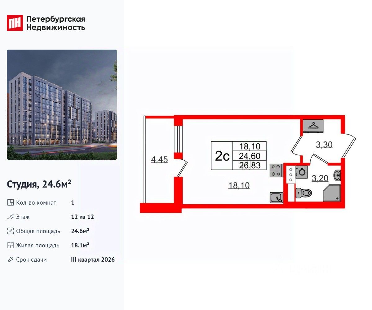 Удобная, классическая, функциональная европланировка, просторная прихожая 3.3 м². Общая площадь студии - 24.6 м², жилая 18.1 м², высота потолка 3 м.