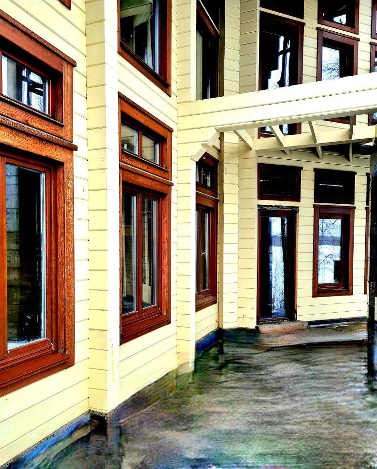 • Несущие стены -монолитный железо-бетон и клееный брус. Фундамент ж/б плита .