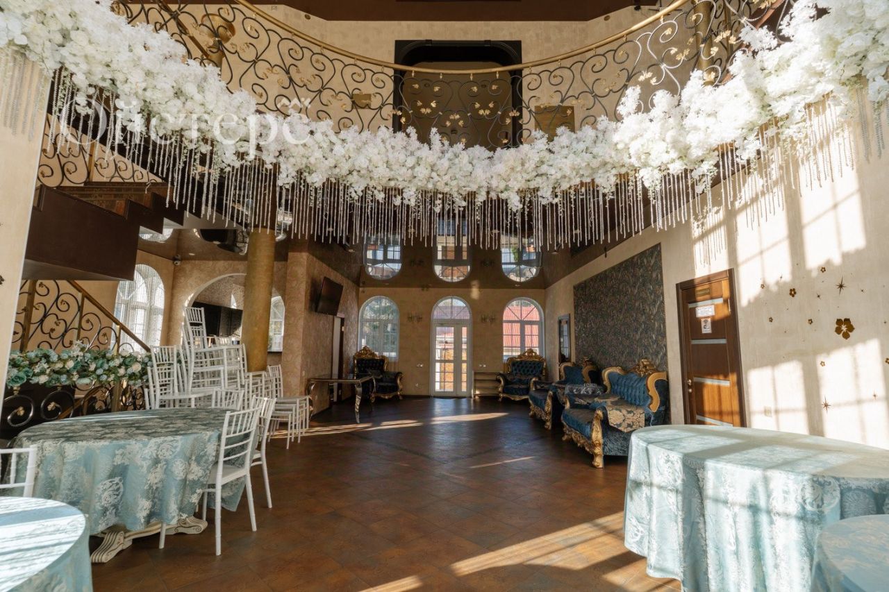 Первое здание включает цокольный этаж с современной кухней, оборудованной газовой плитой, вытяжкой, микроволновой печью и холодильником. На первом этаже расположены большой банкетный зал, бар с барной стойкой и общий санузел.