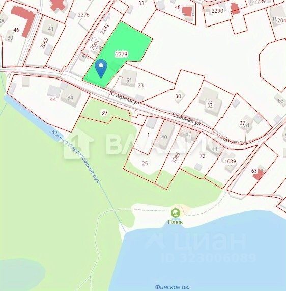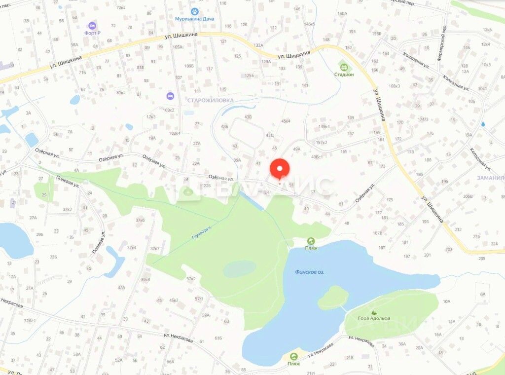 Площадь: 29 соток Назначение: ИЖС (индивидуальное жилищное строительство) Коммуникации: Газ, электричество, вода Расположение: В городской черте, рядом с Финским озером и Шуваловским парком (142 га) Особенности: Сухой и ровный участок на возвышенности с видом на озеро, по границе участка протекает ручей Преимущества: