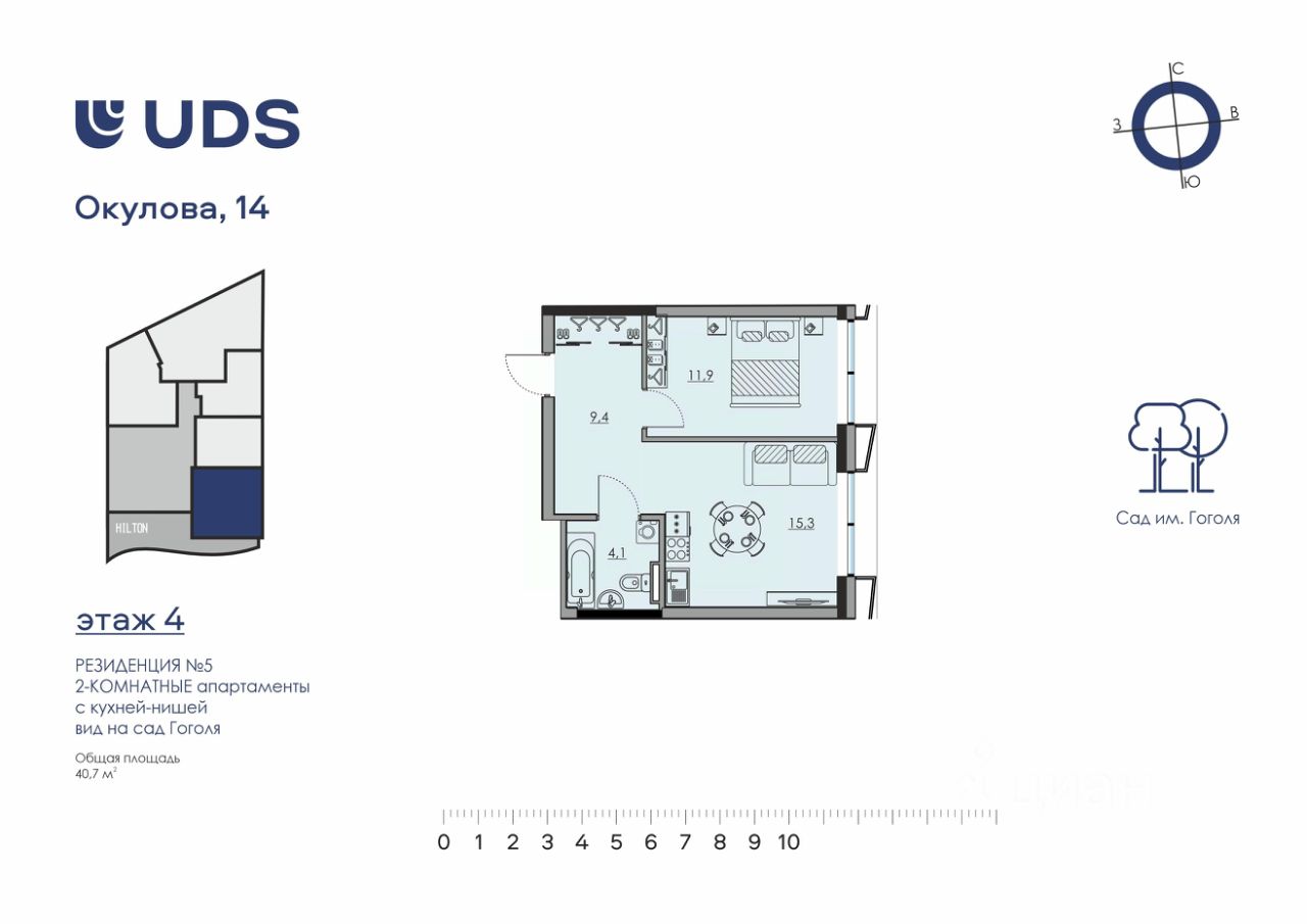 Видовые двухкомнатные апартаменты с кухней-нишей 42,58м2 МФК Окулова 14 от UDS.