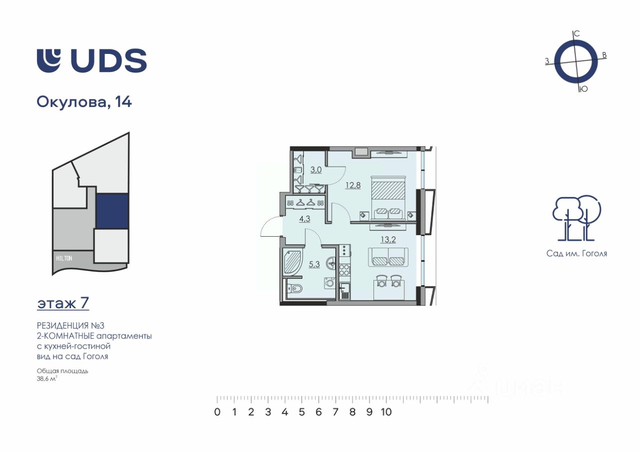 Видовые двухкомнатные апартаменты с кухней-нишей 39,57м2 МФК Окулова 14 от UDS.
