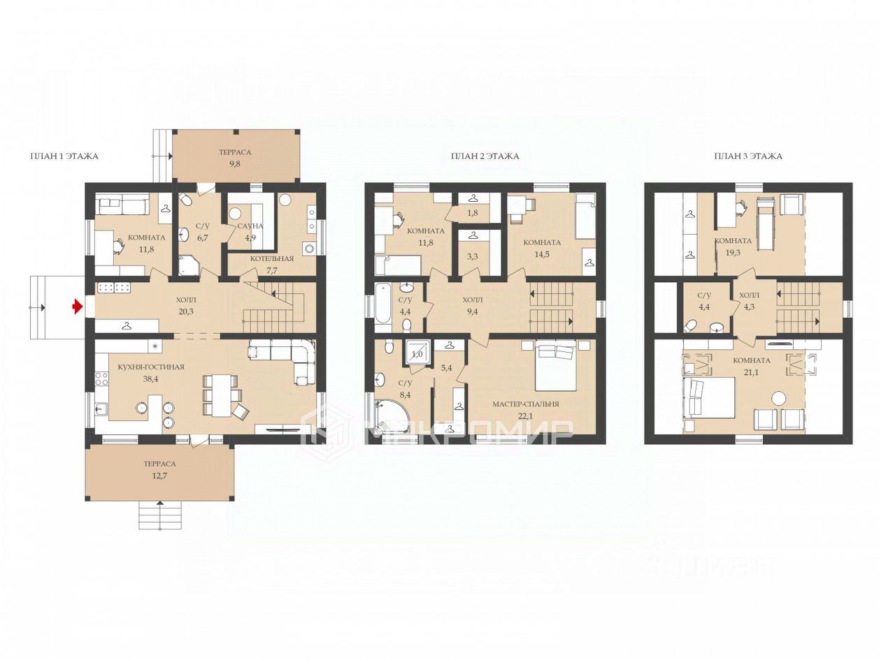 На 1 этаже: холл 20,3 м², котельная 7,7 м², гостевая спальня 11,8 м², кухня-гостиная 38,4 м², с выходом на террасу 12,7 м², санузел и душевая комната 6,7 м², с сауной 5 м², с выходом на террасу 9,8 м².