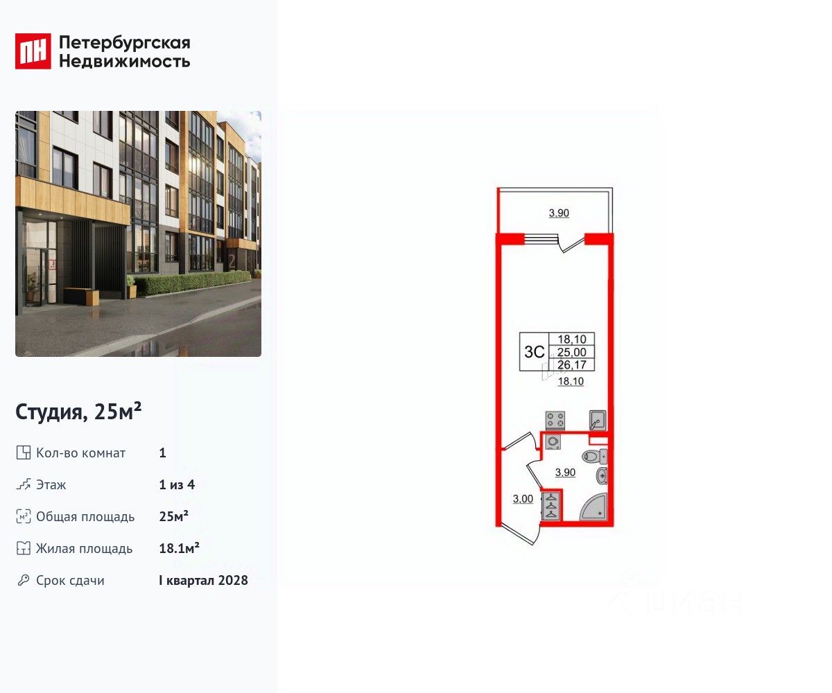 Удобная, классическая, функциональная европланировка, вместительная прихожая 3 м². Общая площадь студии - 25 м², жилая 18.1 м², высота потолка 2.78 м.
