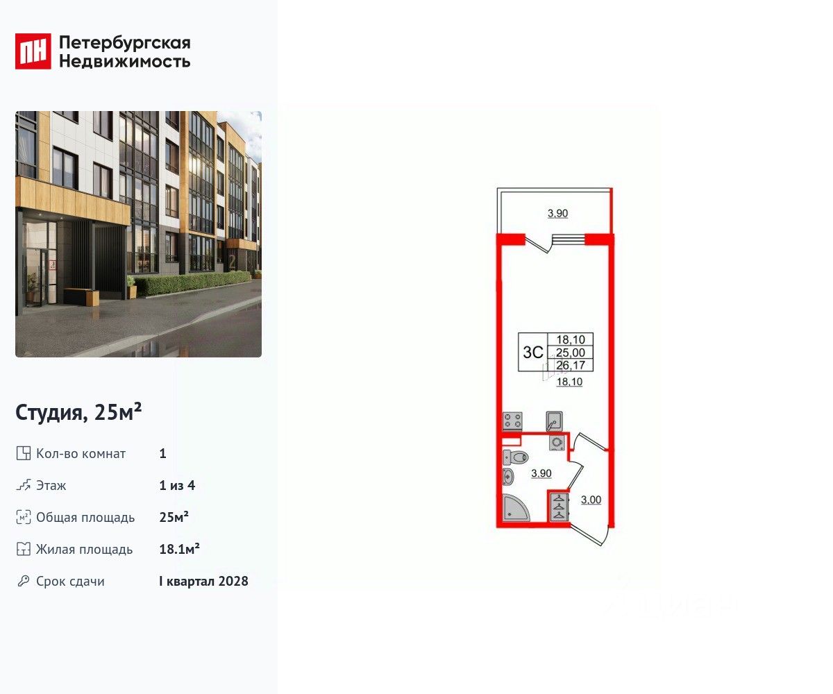 Удобная, классическая, функциональная европланировка, вместительная прихожая 3 м². Общая площадь студии - 25 м², жилая 18.1 м², высота потолка 2.78 м.