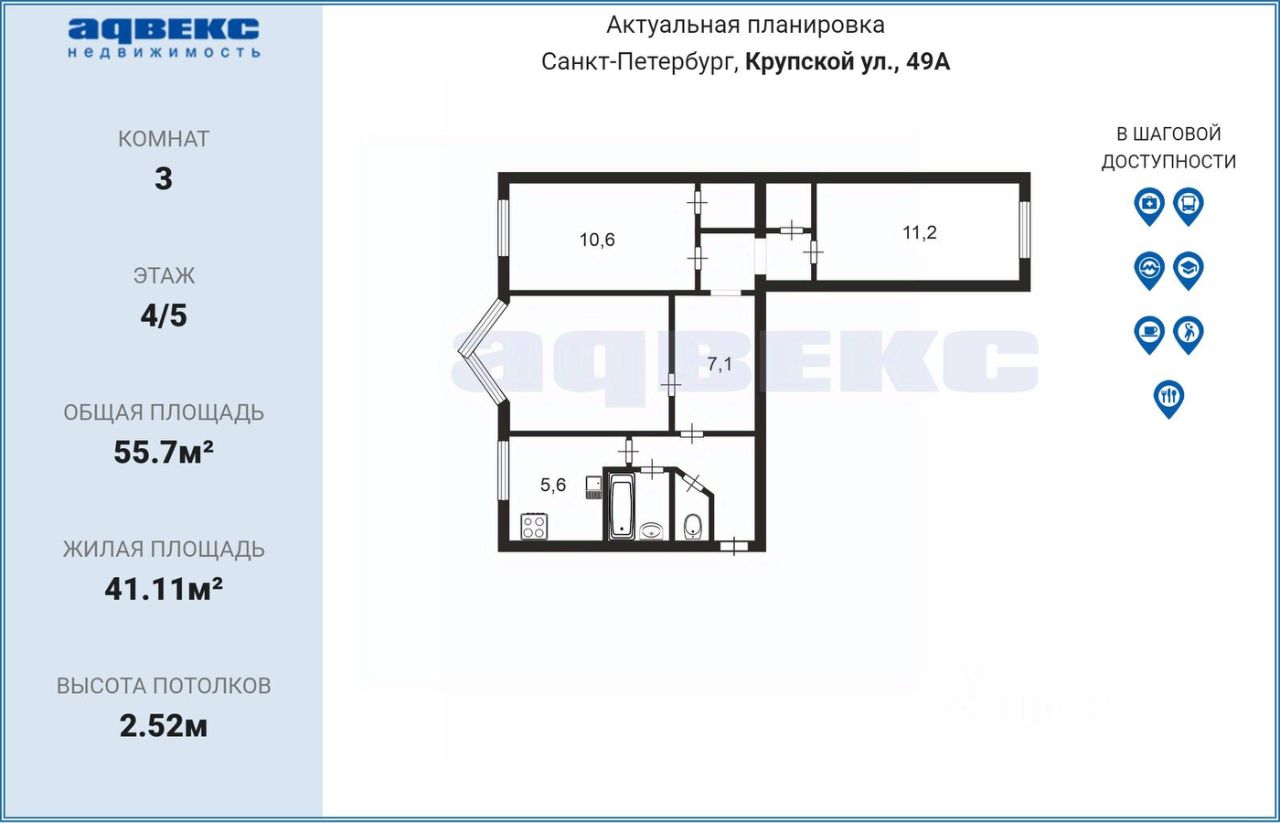 Характеристики квартиры: - Дом кирпичный - Общая площадь: 55,7м - Жилая площадь 41,11м - Кухня 5,56м - 2 вместительные кладовки - Потолки 2,52м - Горячая вода - газовая колонка (не страшно отключение горячей воды) - Газоснабжение - Раздельный санузел
