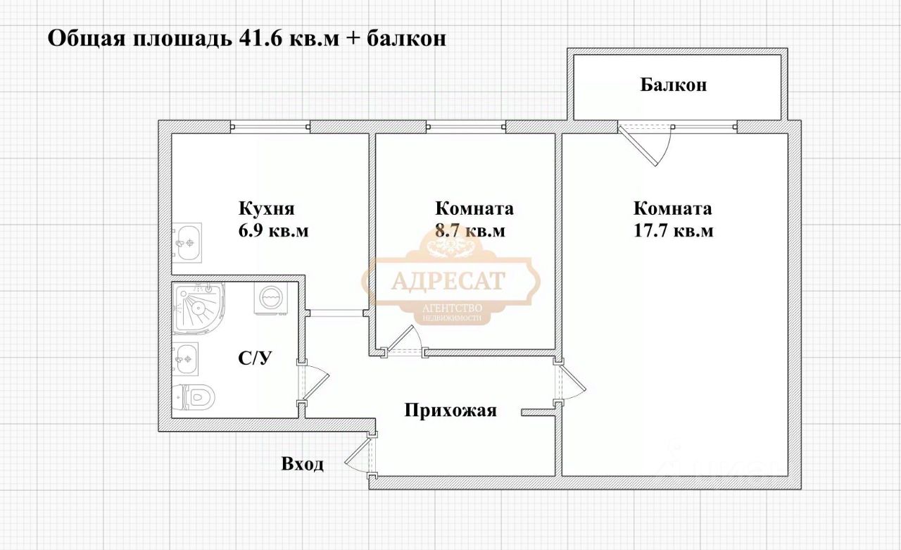 Квартира общей площадью по документам 41.6 кв.м + балкон. Выход на балкон из большой комнаты, он не застеклен. Жилые комнаты 17.7 кв.м и 8.6 кв.м. Кухня 6.9. кв.м. Прихожая 4.6 кв.